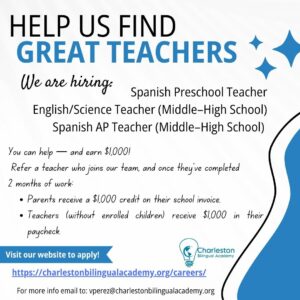 Help Us Find Great Teachers & Earn a $1,000 Bonus! Dear CBA Parents and Teachers, We are continually seeking passionate and qualified teachers to join